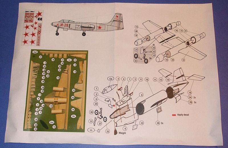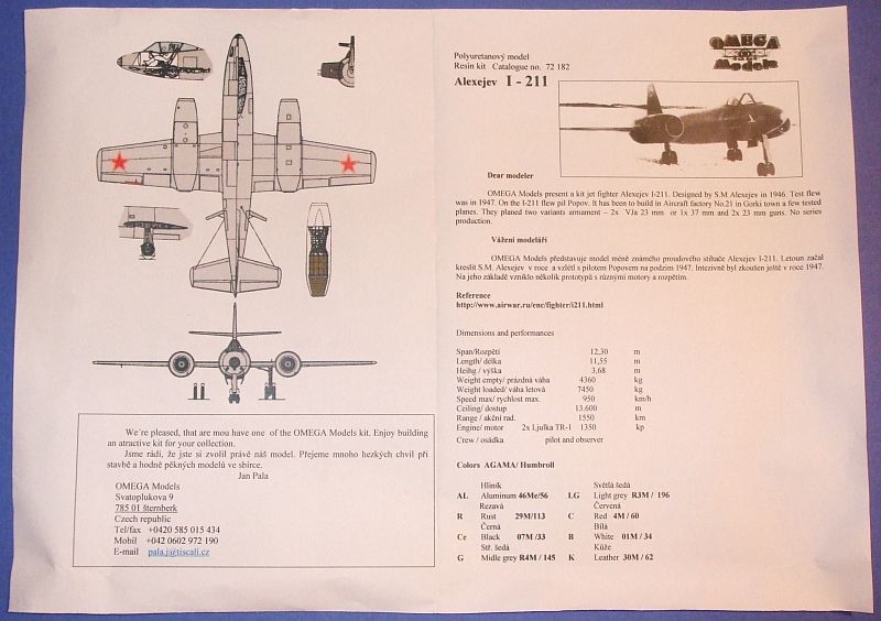 The latest kit from Jan Blik of OMEGA Models is the long awaited Alexeyev I-211 (Alexejev I-211) in 1/72. A completely resin kit with a vacuform canopy, the parts are excellently detailed, good fit and very smooth. The canopy is well formed and even the nose landing light is included! Decals are good, but on some numbers and logo there is a gray background for one of the prototypes. Normally this is not an issue, however, if the modeler wishes to do the Tushino fly-by version, which was all red (Encyclopedia of Russian Aircraft: 1875-1995, by Bill Gunston, Osprey, 1995) this can be a problem.