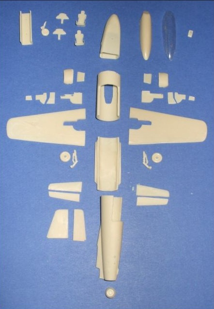 Here are the parts after clean up which involved separation from the casting blocks via microsaw, trimming any excess resin with a hobby knife, sanding off the edges and making the surfaces smooth with sand paper and a file. Next the canopy is carefully cut from the vacuform plastic with a hobby knife with the edges sanded even and smooth. After this each of the parts are test fitted and trimmed as needed. So now we can begin to build the model!