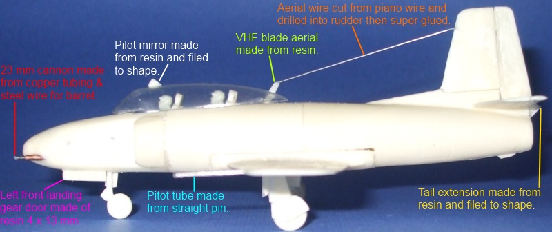 The VHF aerial is also constructed from resin 9 mm with the radio aerial being cut from piano wire. Note that this aerial goes 6 mm from the top of the tail fin. For added security the end can be drilled into the tail fin then secured to the VHF aerial. The pitot tube on the left wing can be cut from a thin wire or straight pin 15 mm long. Again the end can be drilled into the wing before securing.